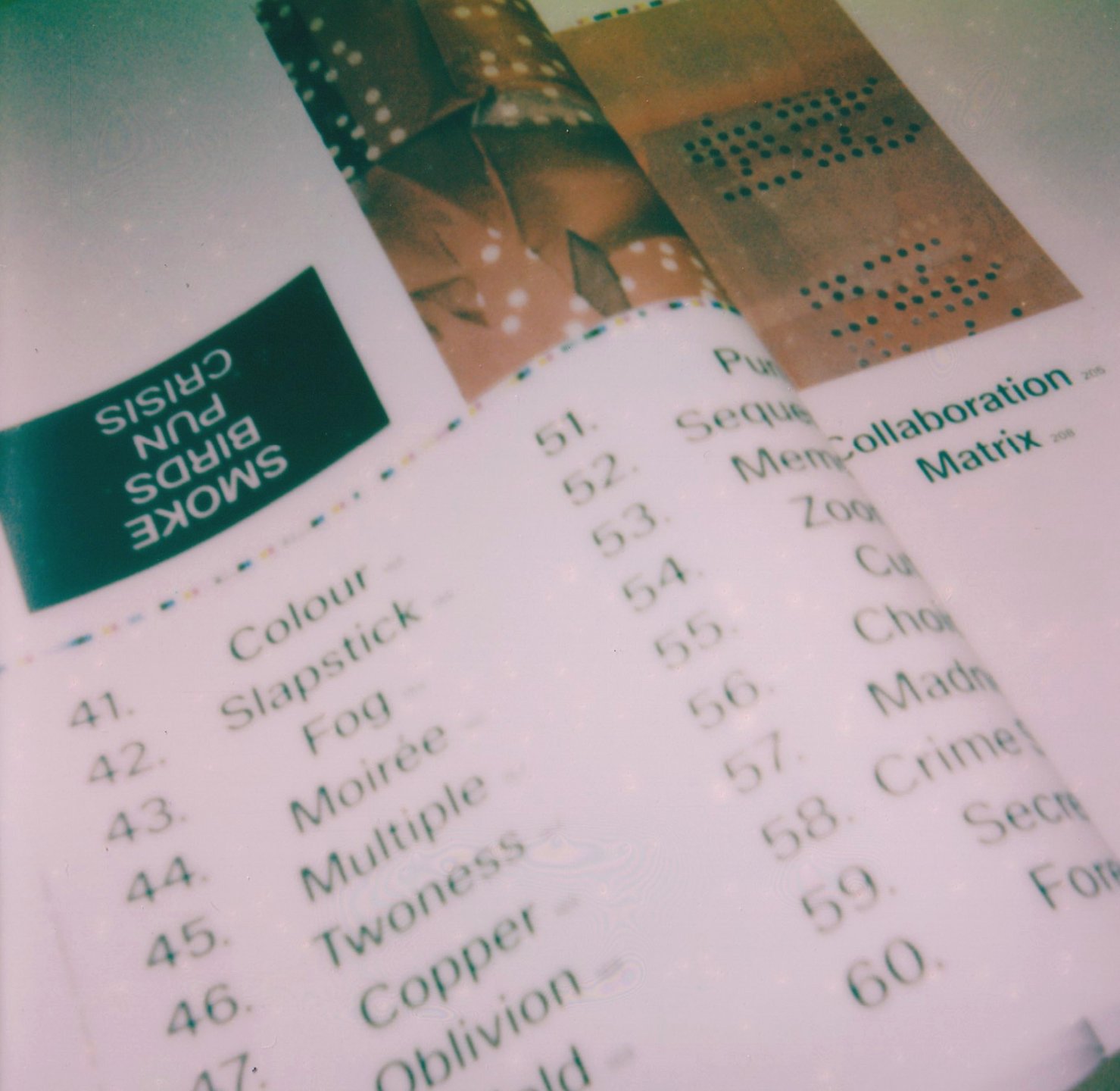 Im Künstler*innenbuch »Smoke, Birds, Pun, Crisis« sind 62 Begriffe in einen Koffer gepackt. Blaupause, Herz, Behälter: Innerhalb dieses Rahmens finden sich, im Dialog zwischen Magdalena Kreinecker, Simon Nagy und vielen Abbildungen ebenso wie unter Einladung einiger Gäste, verschiedenste Textsorten, die um Kreineckers Arbeit kreisen.