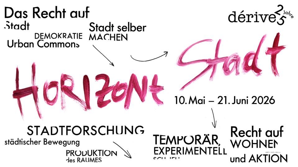 Die Beschäftigung mit dem urbanen Raum, die dérive als Zeitschrift kennzeichnet, umfasst seit den Anfängen neben Untersuchungen aus den Bereichen der Wissenschaft oder des Stadtaktivismus stets auch solche aus dem Feld der Kunst. 25+1 Positionen zu Stadt und Raum – für 25 Jahre dérive – zeigen einen Querschnitt aus diesen künstlerischen Auseinandersetzungen, die in den über 100 Ausgaben von dérive versammelt sind. Verteilt in ausgewählten selbstverwalteten Off-Spaces im 2., 5. und 6. Bezirk Wiens, laden die Beträge zu einem dérive durch die Stadt und eröffnen dabei Themen wie Geschichte und Erinnerung (SUPER, Bezirksmuseum Mariahilf), Landschaft und Stadt (FLUCC) alternative Geographien und die Erkundung städtischer Zusammenhänge (hoast und Sehsaal), Sphären der Arbeit (Size Matters) oder Aktivismus und die Aneignung des öffentlichen Raums (Sussudio und Ve.Sch).